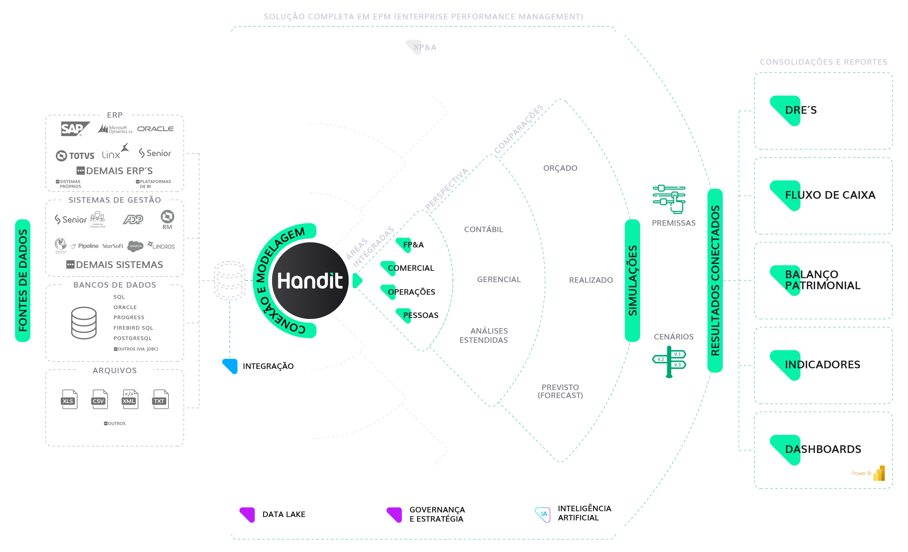A Handit integra, processa e transforma dados de diversas fontes para entregar informações estratégicas de maneira estruturada e conectada. Com isso, times Controladoria, FP&A e CFOs conseguem ter um controle preciso do orçamento, previsões financeiras e impactos de diferentes cenários.